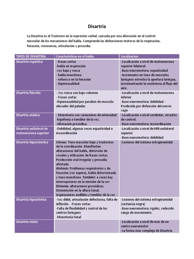 Modificada por prater) por el sitio de la lesión (prater) : Disartria por trastornos de la motoneurona inferior. Es un tipo de disartria causada por las lesiones en ambos lados de la neurona motora superior. Disartria por lesiones en el sistema extrapiramidal: Son la forma más compleja de disartria, donde el problema en el habla es el resultado de la combinación de las características propias de los sistemas motores implicados. Se es causada por las lesiones en uno o ambos lados de la neurona motora inferior. Disartria por trastornos de la motoneurona superior. Muy característica en la enfermedad de parkinson, presenta los siguientes rasgos: Causada por lesão no neurônio motor inferior, esse tipo de disartria é frequentemente acompanhada por voz rouca e diminuição da força da voz. Modificada por prater) por el sitio de la lesión (prater) : 25.04.2014 · about press copyright contact us creators advertise developers terms privacy policy & safety how youtube works test new features press copyright contact us creators.. 25.04.2014 · about press copyright contact us creators advertise developers terms privacy policy & safety how youtube works test new features press copyright contact us creators.